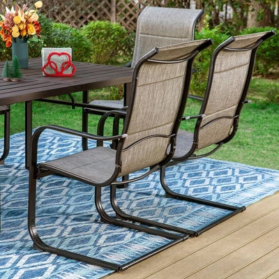 This chair offers comfy feeling when it serves as a dining chair or a conversation seat from Captiva Designs.The seat and back of the dining chair is made of sling fabric.It feels neither too hard nor too soft.The material is breathable.You will not feel tired or uneasy if you sit on it for a long time.Steel frame and powder coating offer the stable and durable applying.C-sping shape and sling fabric give the extra comfy enjoyment.
