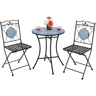 Want to add a touch of glamour to your garden? This 3 set bistro set will be a perfect choice. The folding set includes an exotic mosaic table and two folding chairs to make your garden, patio, balcony and deck more attractive. The spacious round tables and seat allow you to relax and enjoy a cup of coffee while enjoying the view with friends. Besides, the folding chairs are easy to use and easy to store without taking up too much space. Made of weather-resistant ceramic and rust-resistant metal, the 3-piece outdoor table and chair set features strong load-bearing and is easy to maintain, which will accompany you for long time and can be used both indoors.