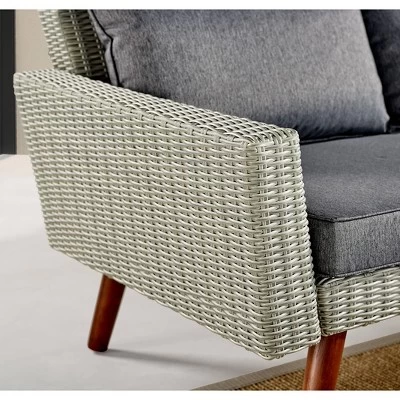 Alaterre Furniture Modern Albany All-Weather Wicker Outdoor Gray Corner Sectional Sofa features Light Gray All-Weather Wicker Outdoor collection is durable to last for several seasons, and features mixed materials for a stylish update to your patio or deck. Square arms and mid-century wooden legs add modern flair. The dark gray cushions provide comfort and are weather-resistant. Recommended to store the cushions indoors.
