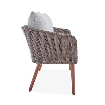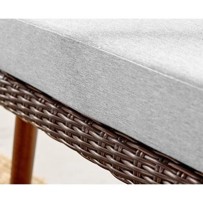 Alaterre Furniture’s Modern Athens All-Weather Wicker Two – Seat Outdoor Brown Bench with Light Gray Cushions features all-weather wicker bench will whisk you away to a tropical island. Enjoy relaxing in this comfortable 2-seat bench with seat and back cushions. With the dark brown wicker seat, dark wood legs and light gray cushions this bench is unique and versatile. Perfect for your porch or patio this two-seat bench is comfortable and will withstand many weather conditions. Cushions are weather-resistant; recommend to store in a covered location.