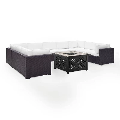 Entertaining outdoors is effortless with the Biscayne 6pc Sectional Set. The extra-large sectional sofa has a durable powder-coated steel frame covered in beautiful all-weather resin wicker. Each seat is topped with lush dyed yarn polyester cushion covers, designed to provide comfort and withstand the elements. With its tiled stone top and lattice panel base, the fire table is a stunning centerpiece for the set. Gas controls and a rack for a propane tank are located inside the table’s base, keeping them close at hand but out of sight. Craft your own personal backyard hideaway with the Biscayne Sectional Set.