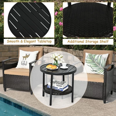 Are you looking for a comfortable sofa set to enjoy your leisure time? Our 3pcs rattan sofa set is your ideal choice. It is made of high-quality rattan material and heavy-duty steel frame, which is solid and durable for outdoor use. Anti-skid mats at the bottom ensure the overall stability and protect the floor. And the rust-resistant tabletop is easy to clean and the lower shelf provides additional space to hold books. Besides, equipped with ergonomic backrest and soft cushions, this sofa set relieves your fatigue of the whole day. Modern and simple style makes this furniture set suitable for your patio, garden and backyard.