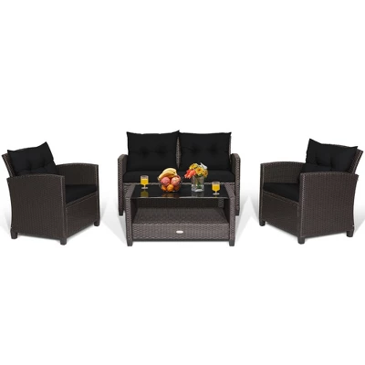 - Easy Assembly & Multiple Use: The assembly is easy with detailed instruction and all accessories. Please do not tighten all the screws until all the holes are aligned. Size of table: 36” x 21.5” x 17”(L x W x H), size of each sofa: 25.5” x 26.5” x 30”(L x W x H), size of loveseat: 49” x 26.5” x 30”(L x W x H). This 4-piece patio furniture set is ideal for the poolside, backyard, balcony and more.