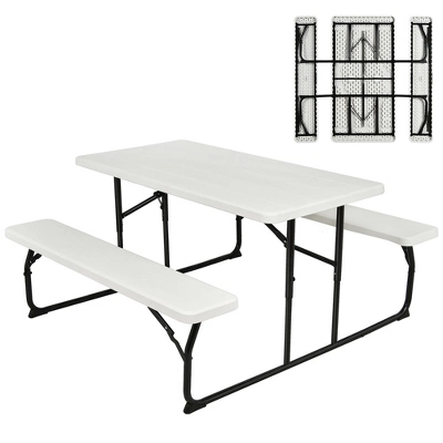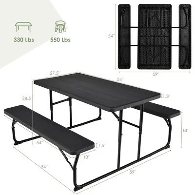 Add an extra folding picnic table bench set in your backyard! It can serve as a BBQ dining table, game table, camping table, picnic table and so on. The desktop is large enough to hold a variety of food and tableware. It has large weight capacity so that it can support up to 550 lbs on each bench. All your friends can take a rest on the bench and enjoy delicious food during your party! Round corners greatly reduce the risk of bumping. Made of selected materials, this camping picnic table is all-weather resistant to ensure a long service life. Besides, the smooth surface is easy to clean after party.
