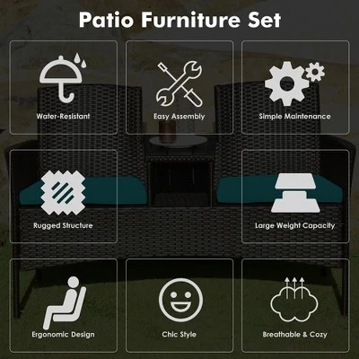 Enjoy outdoor leisure time with this patio conversation set. Featuring rugged structure and high-quality PE rattan, this patio furniture set is built to stand up to harsh weather conditions and great for outdoor using. In addition, this patio loveseat set comes with a coffee table between 2 seats that provide enough space for books and cups. And this patio loveseat sofa set is more practical than traditional loveseat sofa and more space-saving than 3-piece patio furniture set. Besides, wide armrest and curved backrest ensures you will love the comfortable feel of the patio conversation. The thickly cushioned patio sofa set chairs for maximum comfort and excellent seating experience. By the way, this conversation is easy assembly.