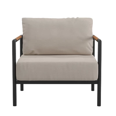 Enjoy your morning matcha tea or favorite coffee while you watch the sun come up when you purchase this modern indoor/outdoor patio chair. Boasting a black metal frame with teak accented arms as well as included back and seat cushions, everything you need to create a gorgeous seating area is included in the box. The straight frame arms give you a platform to rest your hands while you apply that great new shade of nail polish. Bring along their pet bed and let your four-legged friend relax alongside you in the sunroom or on the deck at home. Provide outdoor seating options for your patrons at your restaurant or deli. Whether used in your home or business, you should never have to worry about the state of your seating. The lightweight aluminum frame is powder coated to withstand the rigors of year-round use however, care should be taken to protect from prolonged periods of wet weather. Sturdy metal screw construction holds up to 300 lbs. of static weight to accommodate most users. With chilly nights on the way, this generously cushioned chair would offer highly supportive seating in the backyard around our 22″ round wood-burning firepit. Get comfy in leggings and a sweatshirt and grab your softest blanket then snuggle in around the fire. Assembly of your new patio chair comes together in 30 minutes or less with included materials. Durable fabric cushions are zippered for removal and may be spot cleaned with water and a dry cloth. Fixed plastic floor glides protect your hard flooring surfaces when used indoors. Purchase several of these indoor/outdoor patio chairs or pair them with our modern black aluminum framed loveseat to create a beautiful place to gather together no matter where you are.