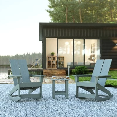 Take comfort anywhere you are with this set of 2 commercial grade modern dual slat Adirondack rocking chairs with side table. This 3 piece seating set boasts an update on the classic Adirondack chair and perfectly suited to both home and business use. The smooth motion rockers allow you to rest and relax while the side table holds your belongings or decor. Designed to stand up to almost any environment, this indoor/outdoor seating set is long-lasting. Constructed from polystyrene, this table and 2 chair set is more durable than plastic and won’t chip, splinter or peel but is lightweight and easily portable. Metal screws securely join all pieces allowing the chairs to hold up to 350 lbs. static weight and the table holds up to 200 lbs. static weight capacity. UV treated, weather and stain resistant, and easily cleaned this poly resin patio furniture set is perfect for any living space. Assembly takes less than 30 minutes per piece for your convenience.