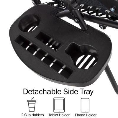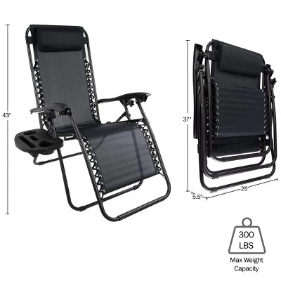 Spend your days outdoors reclining in comfort with the Set of Two Zero Gravity Chairs from Hastings Home. These durable chairs are made of a tubular steel double bungee cords that attach the breathable textilene fabric to the frame and padded arm rests that lock the chair in the reclining position of your choice. Whether you take these chair to the beach, on a camping trip, or on the back deck, weightless anti-gravity feel, convenient side tray with compartment for drinks or your cell phone and folding design offer optimal relaxation wherever you take them.Includes a set of 2 chairs that fold down for compact storage and easy transport to the beach, campground, or backyard barbequeAdjustable reclining positions mimics a gravity free environment that alleviates pressure points while lounging comfortablyA double bungee cord connects fabric seat to the durable tubular steel frame to support up to 300lbs in each chairThe textilene fabric is ideal for outdoor use, the breathable mesh prevents heat transfer and resists fading from the harsh UV raysA handy side table is attached to each chair and has 2 drink holders and 2 slim slots that keep ipads, tablets and cell phones at handEach chair is equipped with pillows that are adjustable for use as a neck rest or lumbar supportMaterials – Powder Coated Steel, Plastic & Textilene Fabric. Color &ndash BlackDimensions: (L) 63.5 x (W) 25 x (H) 43-inches. Folded: (L) 25 x (W) 5.5 x (H) 37-inches