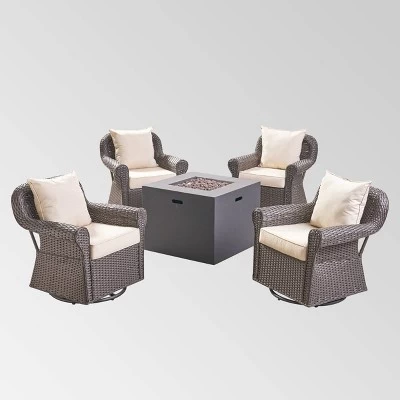 Give your guests a warm welcome with this Christopher Knight Home Julian 5 pc Swivel Club Chair and Fire Pit Set. This chat set will bring your backyard space a beautiful rustic feel without the hazard of using real wood. This is a perfect centerpiece for any patio or backyard space, allowing easy seating arrangement for you and your guests and the fire pit keeps you warm and comfortable no matter the weather. With four lavishly cushioned seats to share, there will be room for everybody on your invite list. You can not go wrong with this Christopher Knight Home Julian 5 pc Swivel Club Chair and Fire Pit Set.