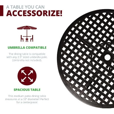 Indulge in an elegant outdoor dining experience with the Kinger Home Lily 33–inch Round Outdoor Dining Table. Crafted with a strong cast aluminum frame, this modern lattice weave-designed patio dining table is both stylish and durable. The compact round table provides ample dining space and includes a 2″ umbrella hole. Pre-installed adjustable foot levelers were included for stability.