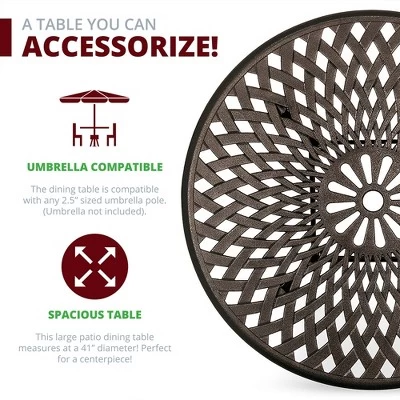 Indulge in an elegant outdoor dining experience with the Kinger Home Arden 41–inch Outdoor Dining Table. Crafted with a strong cast aluminum frame, this lattice weave-designed dining table is both stylish and durable. The round table provides ample dining space and includes a 2.5″ umbrella hole. Pre-installed adjustable foot levelers were included for stability.