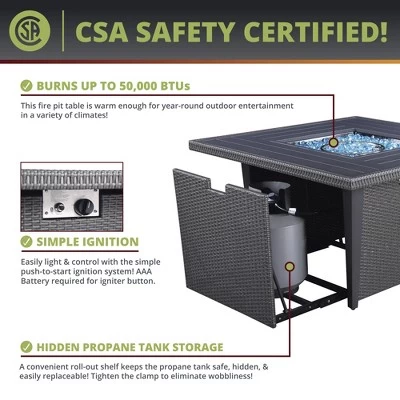 With the Ethan 5-Piece 42 -inch Propane Fire Pit Table Set, your backyard will become a cozy and stylish retreat! This high-quality gas fire pit patio set is crafted from sturdy powder-coated aluminum and synthetic rattan wicker, to last for many seasons. Transform your fire pit into a dining table with the included burner lid. The push-button ignition system provides convenient control, allowing you to ignite the fire in seconds. Let the inviting atmosphere of this outdoor conversation set captivate your guests.