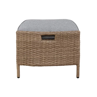 Create a cozy oasis with this conversation set. This set is perfect for your patio, sunroom, or balcony. All-weather resin wicker surrounds a 100% aluminum rust-proof, powder coated frame. Weather-resistant polyester cushions add to the comfort and style of this collection. The set includes 2 chairs with cushions, 2 ottomans with cushions and an 17″H accent table.