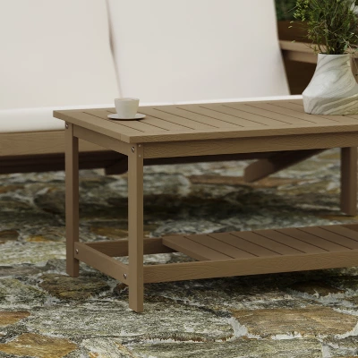 Mirror the classic design of your Adirondack furniture with this lattice top 2 tier indoor/outdoor coffee table. Constructed from polyresin patio table won’t chip, splinter or peel but is lightweight and easily portable. Metal screws securely join all pieces of this poly resin table allowing it to hold up to 200 lbs. static weight capacity and the extra shelf lends plenty of storage space. UV, weather and stain resistant, this patio furniture table is ideal for your deck, patio or poolside and assembles in 10 minutes or less for your convenience.