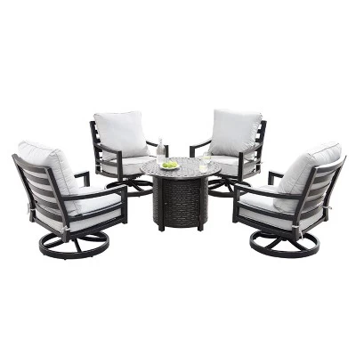 Whether your outdoor retreat is located in the mountains, on the coast, or somewhere in between, this fire table set will extend your evenings with friends and family around the fire. With this addition you can enhance your outdoor setting with even more ambiance and relaxation. This fire table set comes with an Outdoor Aluminum 34 in. Round Fire Table Set with Four Deep Seating Swivel Rocking Chairs, Fire Beads, Lid, Propane Tank Cover and Table Fabric Cover. The dimensions for the fire table are: 34″ L x 34″ W x 24.5″ H, 55 lbs. Each chair dimensions are: 28.3″ L x 33.8″ W x 34.2″ H, 27.3 lbs. The chair seat is 12.6″ H from the seat to the floor.