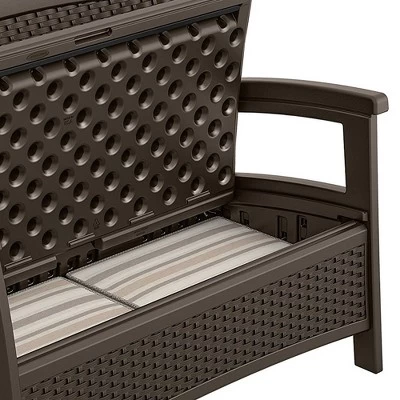 Look classy while you sit and entertain outdoors with this Suncast Elements Wicker Design Loveseat with Storage.It’s a backyard party when this decorative wicker design loveseat makes a home in your outdoor scene. Full of comfort and convenience, this java loveseat has a contoured air-cushion back, extra-large armrests, and is cozy for 2 people. It has a 23-gallon storage capacity under the seat for your outdoor goodies and the seat supports up to 450 pounds.Step up your patio furniture game and enjoy the great outdoors pleasantly with this Suncast Elements Wicker Design Loveseat. This package will also include this Suncast outdoor trash hideaway has a stylish design that looks great on most patios or decks.